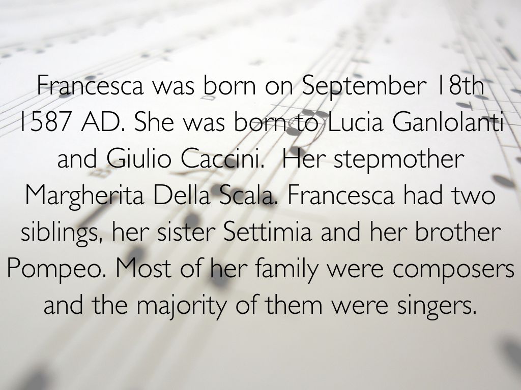 Francesca was born on September 18th 1587 AD. She was born to Lucia Ganlolanti and Giulio Caccini. Her stepmother Margherita Della Scala. Francesca had two siblings, her sister Settimia and her brother Pompeo. Most of her family were composers and the majority of them were singers.