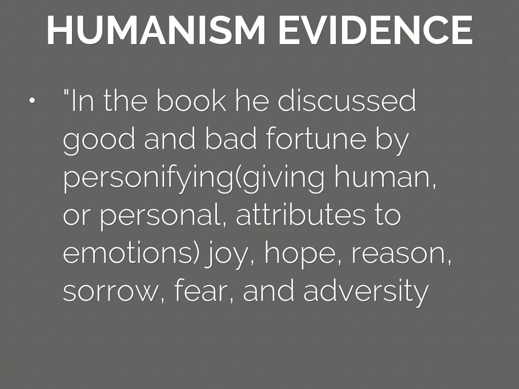 "In the book he discussed good and bad fortune by personifying(giving human, or personal, attributes to emotions) joy, hope, reason, sorrow, fear, and adversity