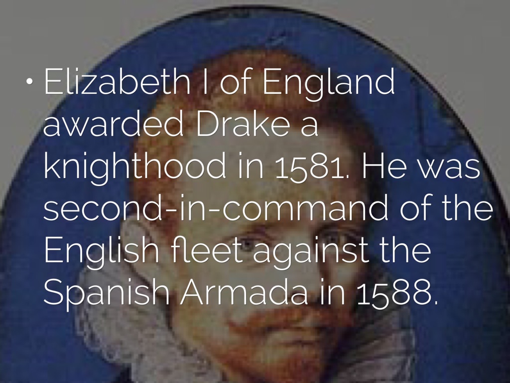 Elizabeth I of England awarded Drake a knighthood in 1581. He was second-in-command of the English fleet against the Spanish Armada in 1588.