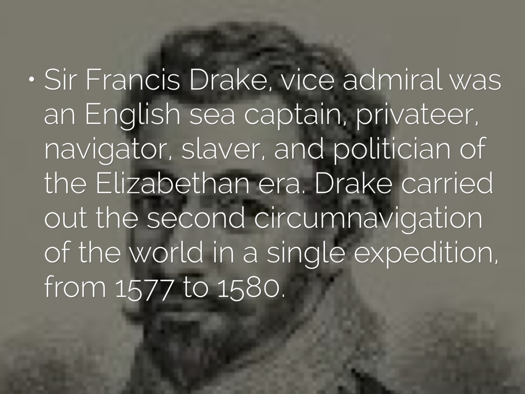 Sir Francis Drake, vice admiral was an English sea captain, privateer, navigator, slaver, and politician of the Elizabethan era. Drake carried out the second circumnavigation of the world in a single expedition, from 1577 to 1580.