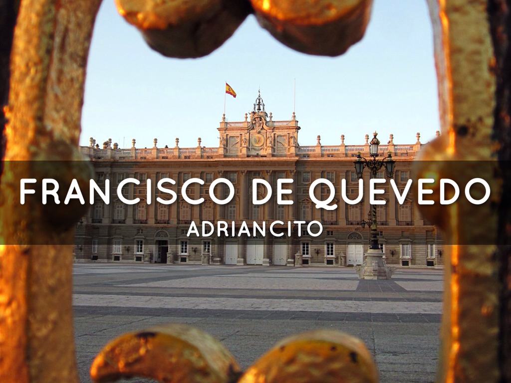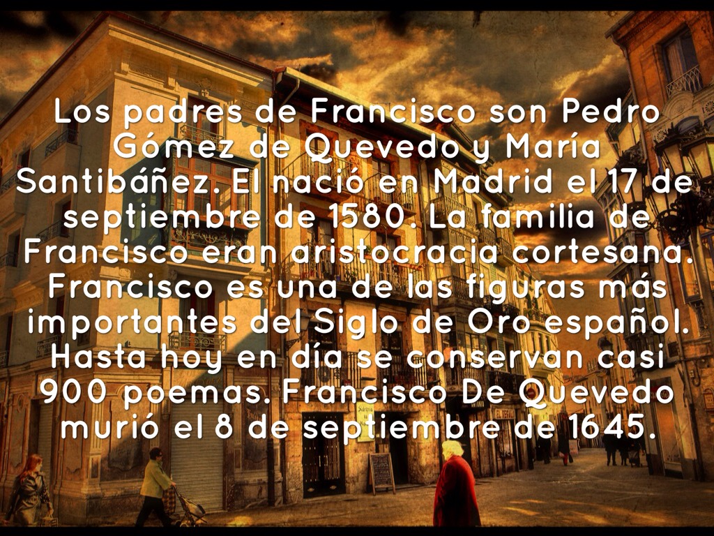Los padres de Francisco son Pedro Gómez de Quevedo y María Santibáñez. El nació en Madrid el 17 de septiembre de 1580. La familia de Francisco eran aristocracia cortesana. Francisco es una de las figuras más importantes del Siglo de Oro español. Hasta hoy en día se conservan casi 900 poemas. Francisco De Quevedo murió el 8 de septiembre de 1645.