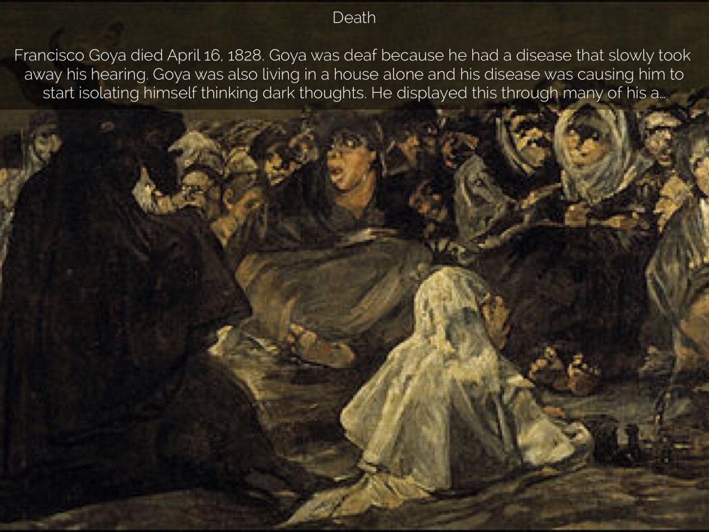 Francisco Goya died April 16, 1828. Goya was deaf because he had a disease that slowly took away his hearing. Goya was also living in a house alone and his disease was causing him to start isolating himself thinking dark thoughts. He displayed this through many of his artworks by the dark and evil environments.