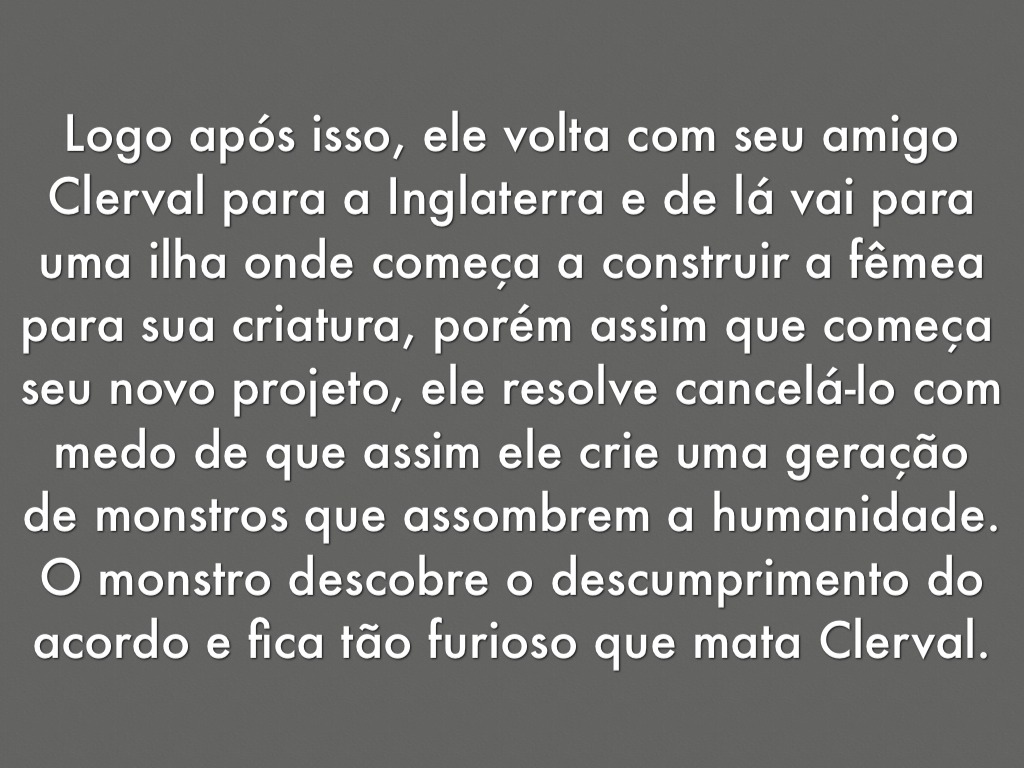 Logo após isso, ele volta com seu amigo Clerval para a Inglaterra e de lá vai para uma ilha onde começa a construir a fêmea para sua criatura.