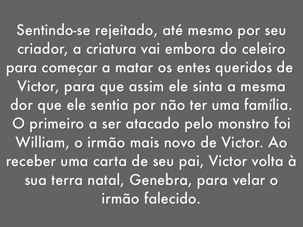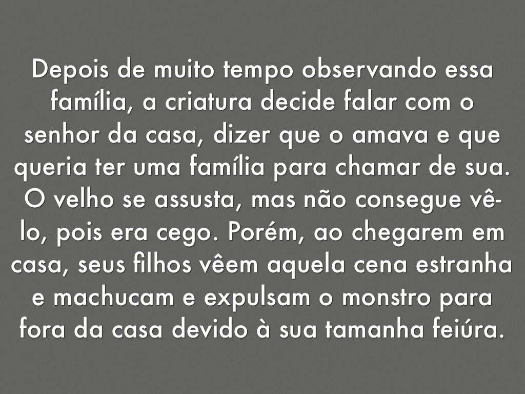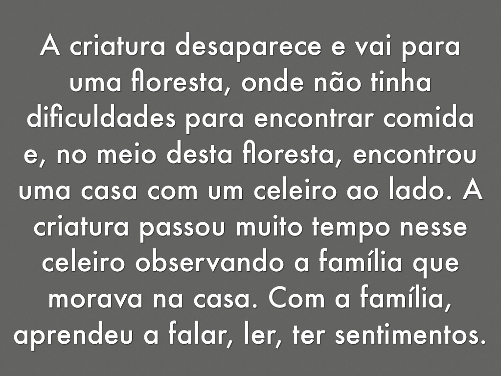 Depois de muito tempo observando essa família, a criatura decide falar com o senhor da casa, dizer que o amava e que queria ter uma família para chamar de sua.