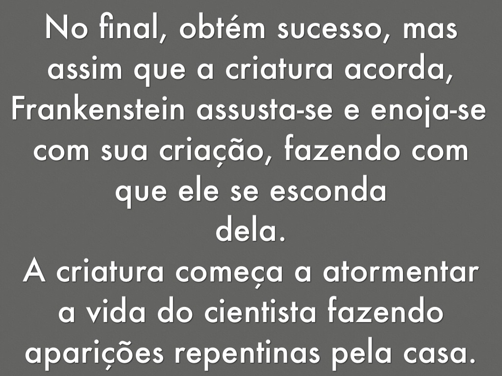 No final, obtém sucesso, mas assim que a criatura acorda, Frankenstein assusta-se e enoja-se com sua criação, fazendo com que ele se esconda