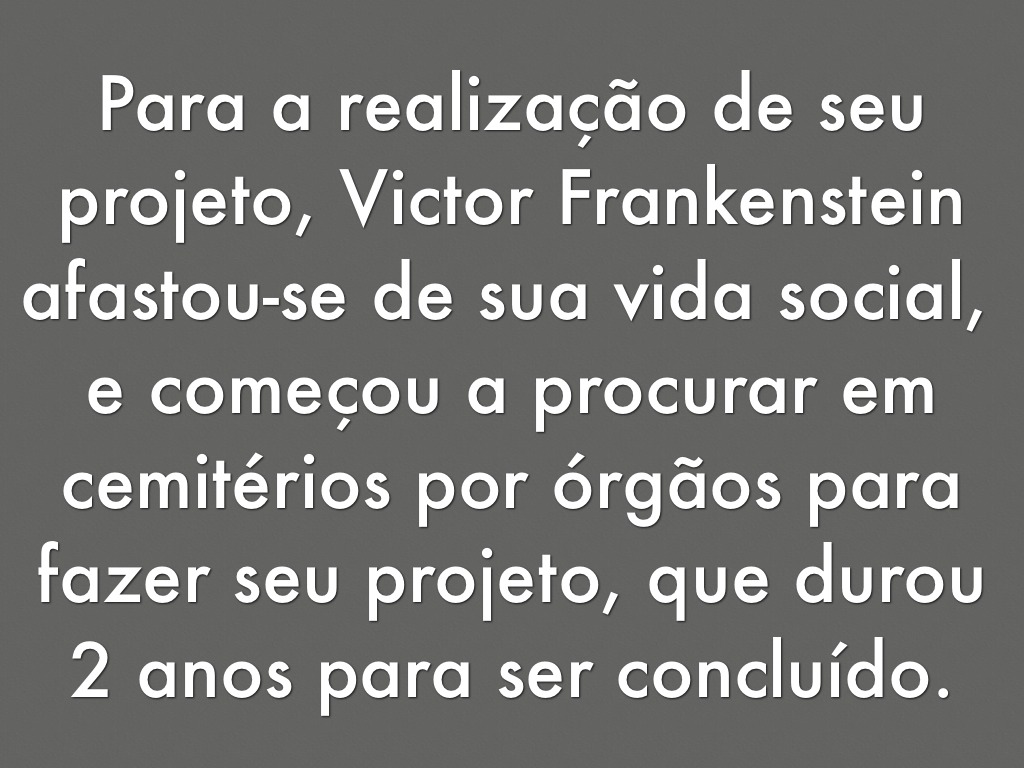 Para a realização de seu projeto, Victor Frankenstein afastou-se de sua vida social, e começou a procurar em cemitérios por órgãos para fazer seu projeto, que durou 2 anos para ser concluído.