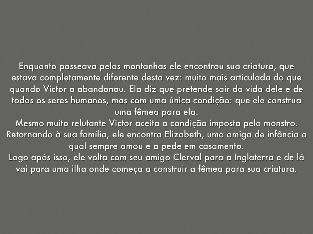 Mesmo muito relutante Victor aceita a condição imposta pelo monstro.