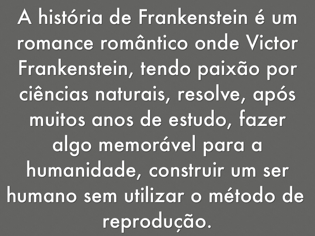 A história de Frankenstein é um romance romântico onde Victor Frankenstein, tendo paixão por ciências naturais, resolve, após muitos anos de estudo, fazer algo memorável para a humanidade, construir um ser humano sem utilizar o método de reprodução.
