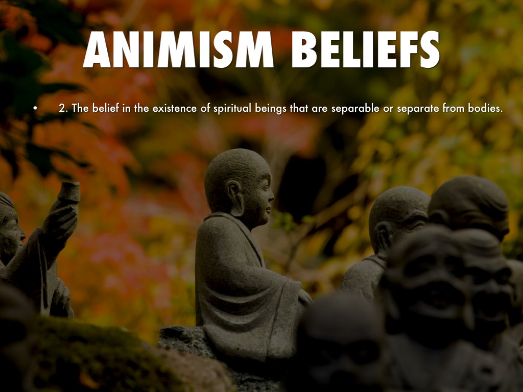 TTHE BELIEF IN THE EXISTENCE OF INDIVIDUAL SPIRITS THAT INHABIT NATURAL OBJECTS AND PHENOMENA. NOMENANMKKK