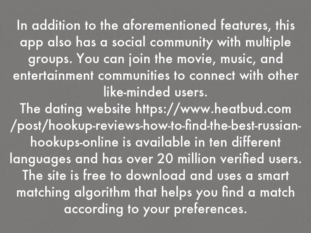 The dating website https://www.heatbud.com/post/hookup-reviews-how-to-find-the-best-russian-ho... is available in ten different languages and has over 20 million verified users. The site is free to download and uses a smart matching algorithm that helps you find a match according to your preferences.