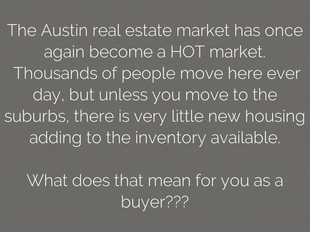 The Austin real estate market has once again become a HOT market. Thousands of people move here ever day, but unless you move to the suburbs, there is very little new housing adding to the inventory available.