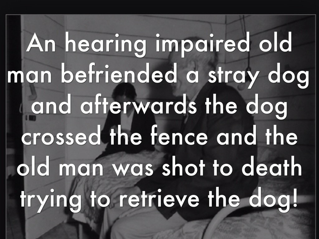 An hearing impaired old man befriended a stray dog and afterwards the dog crossed the fence and the old man was shot to death trying to retrieve the dog!