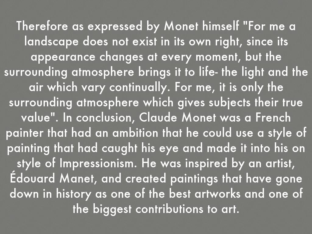 Therefore as expressed by Monet himself "For me a landscape does not exist in its own right, since its appearance changes at every moment, but the surrounding atmosphere brings it to life- the light and the air which vary continually. For me, it is only the surrounding atmosphere which gives subjects their true value". In conclusion, Claude Monet was a French painter that had an ambition that he could use a style of painting that had caught his eye and made it into his on style of Impressionism. He was inspired by an artist, Édouard Manet, and created paintings that have gone down in history as one of the best artworks and one of the biggest contributions to art.