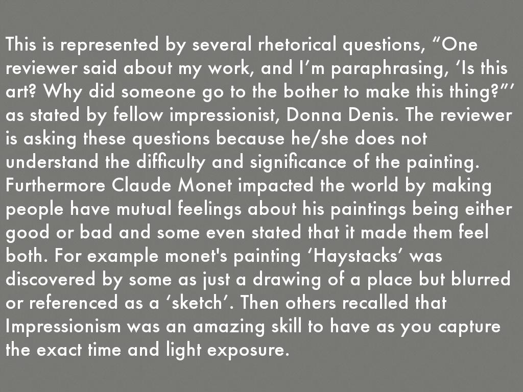 This is represented by several rhetorical questions, “One reviewer said about my work, and I’m paraphrasing, ‘Is this art? Why did someone go to the bother to make this thing?”’ as stated by fellow impressionist, Donna Denis. The reviewer is asking these questions because he/she does not understand the difficulty and significance of the painting. Furthermore Claude Monet impacted the world by making people have mutual feelings about his paintings being either good or bad and some even stated that it made them feel both. For example monet's painting ‘Haystacks’ was discovered by some as just a drawing of a place but blurred or referenced as a ‘sketch’. Then others recalled that Impressionism was an amazing skill to have as you capture the exact time and light exposure.