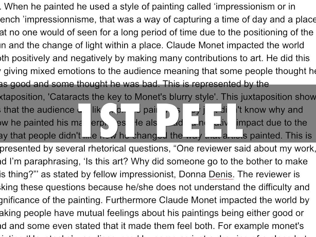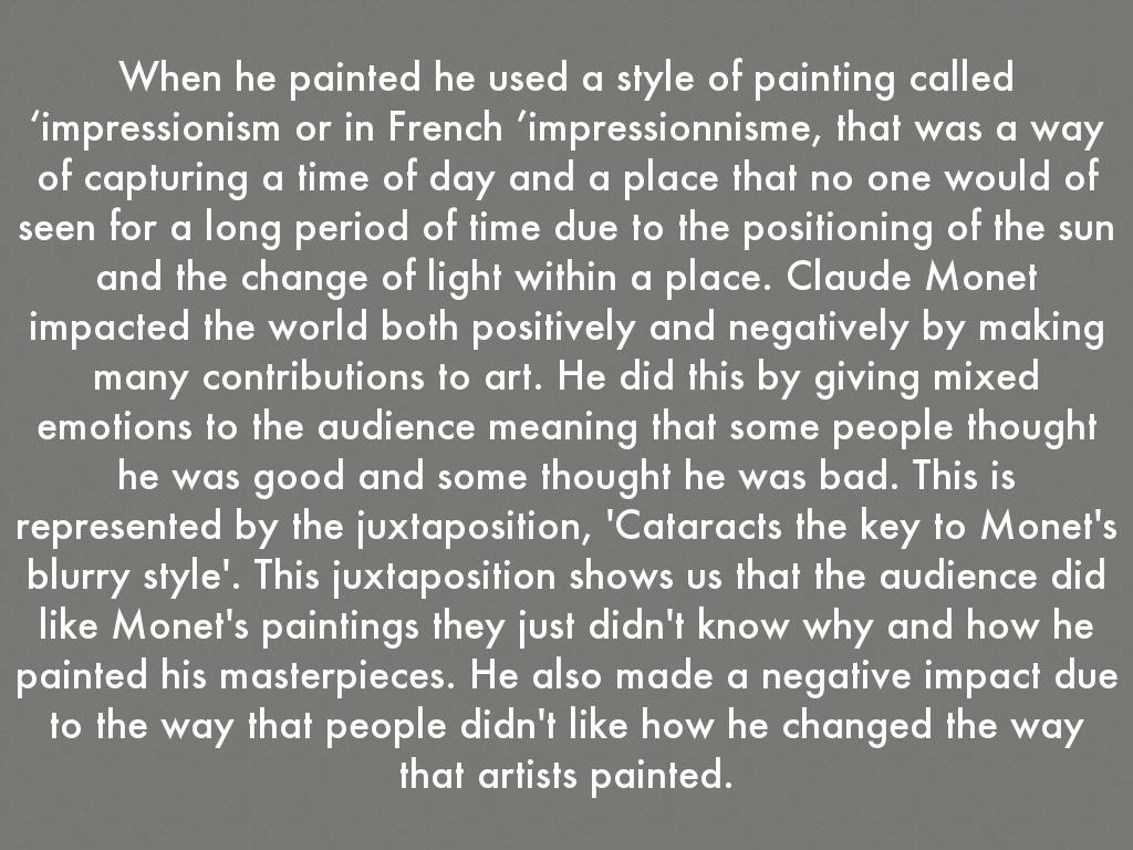 When he painted he used a style of painting called ‘impressionism or in French ’impressionnisme, that was a way of capturing a time of day and a place that no one would of seen for a long period of time due to the positioning of the sun and the change of light within a place. Claude Monet impacted the world both positively and negatively by making many contributions to art. He did this by giving mixed emotions to the audience meaning that some people thought he was good and some thought he was bad. This is represented by the juxtaposition, 'Cataracts the key to Monet's blurry style'. This juxtaposition shows us that the audience did like Monet's paintings they just didn't know why and how he painted his masterpieces. He also made a negative impact due to the way that people didn't like how he changed the way that artists painted.