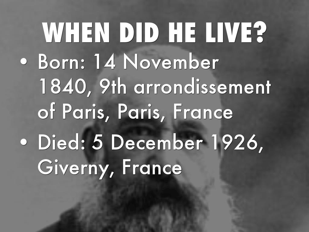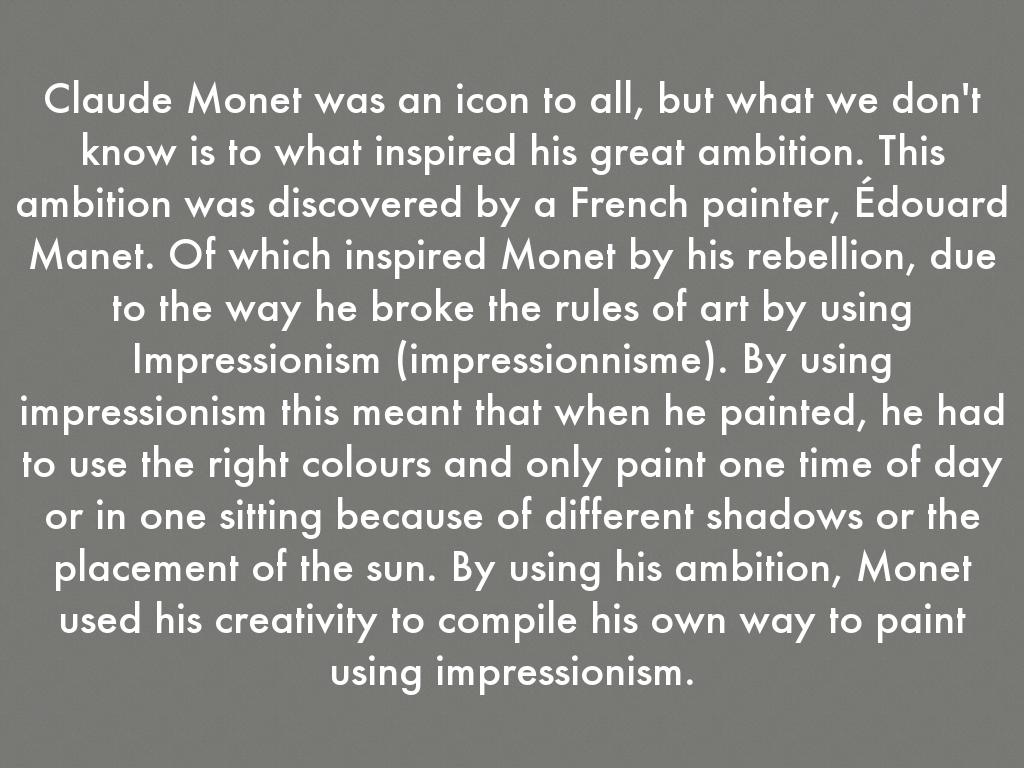Claude Monet was an icon to all, but what we don't know is to what inspired his great ambition. This ambition was discovered by a French painter, Édouard Manet. Of which inspired Monet by his rebellion, due to the way he broke the rules of art by using Impressionism (impressionnisme). By using impressionism this meant that when he painted, he had to use the right colours and only paint one time of day or in one sitting because of different shadows or the placement of the sun. By using his ambition, Monet used his creativity to compile his own way to paint using impressionism.