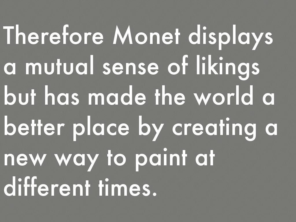Therefore Monet displays a mutual sense of likings but has made the world a better place by creating a new way to paint at different times.