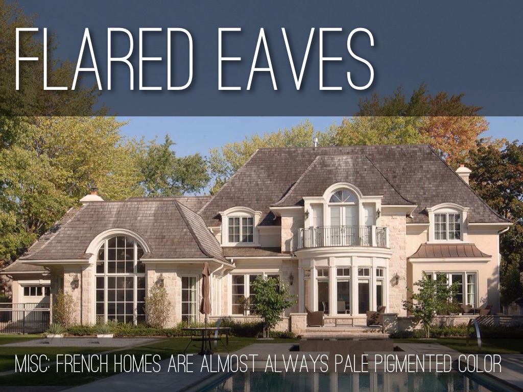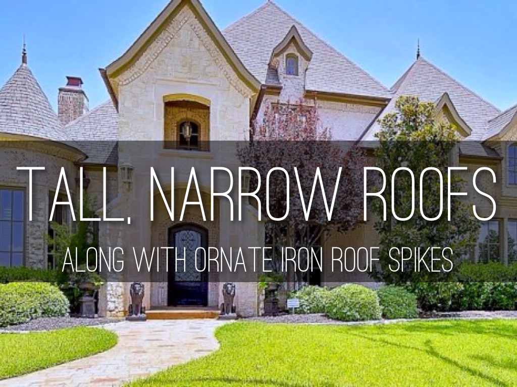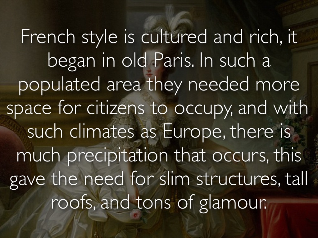 French style is cultured and rich, it began in old Paris. In such a populated area they needed more space for citizens to occupy, and with such climates as Europe, there is much precipitation that occurs, this gave the need for slim structures, tall roofs, and tons of glamour.