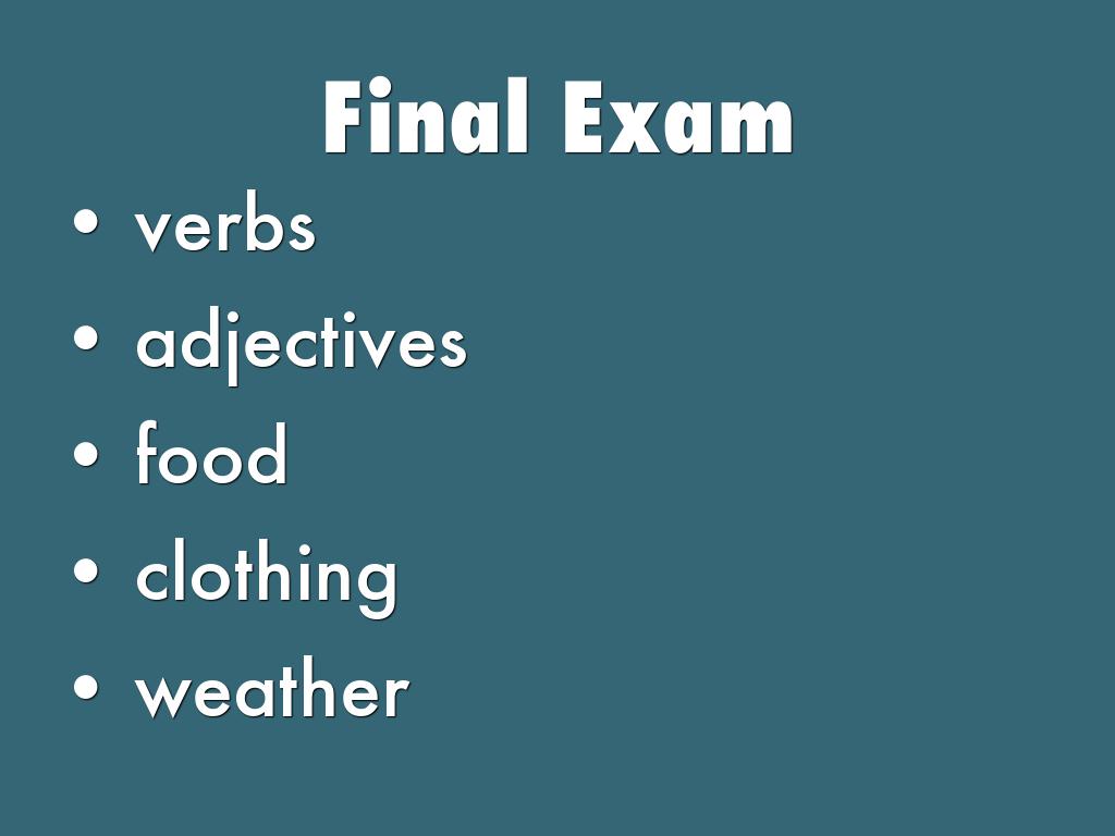 For french there is a final exam. The main things that will be on there are: verbs, adjectives, food, clothing, and weather.