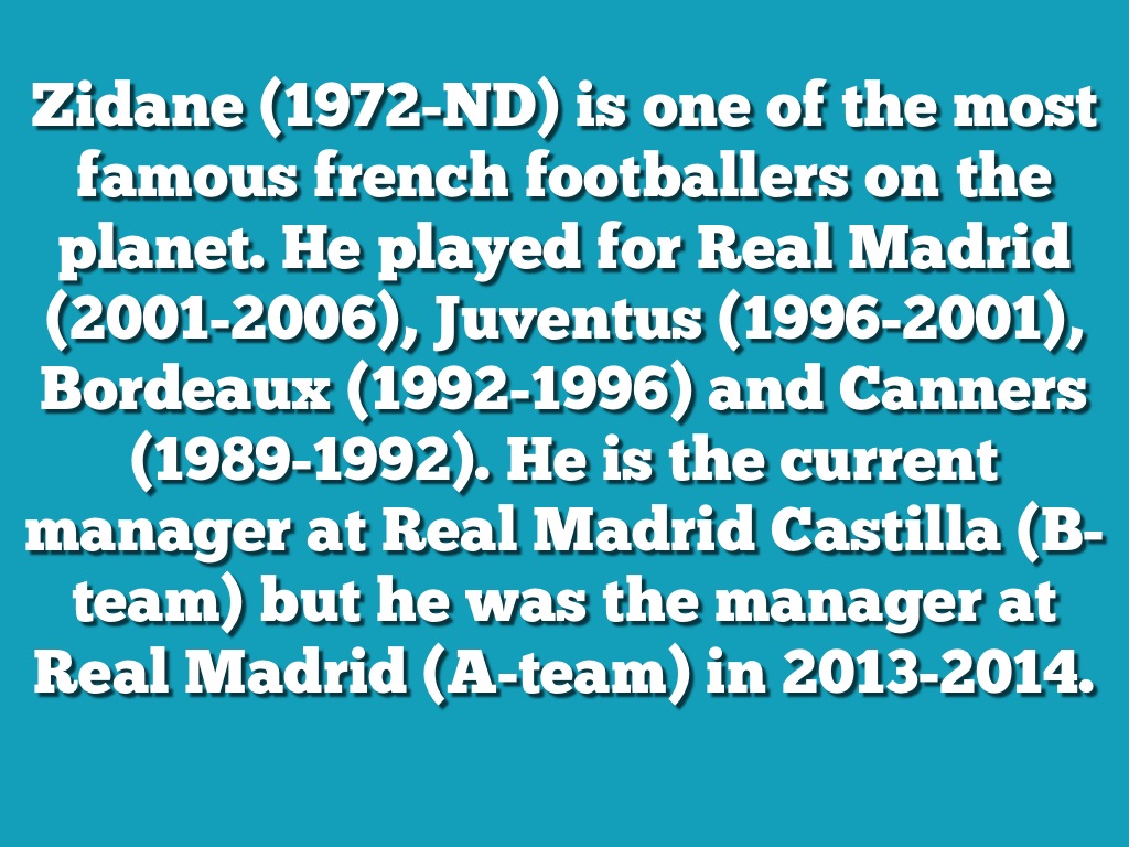 Zidane (1972-ND) is one of the most famous french footballers on the planet. He played for Real Madrid (2001-2006), Juventus (1996-2001), Bordeaux (1992-1996) and Canners (1989-1992). He is the current manager at Real Madrid Castilla (B-team) but he was the manager at Real Madrid (A-team) in 2013-2014.