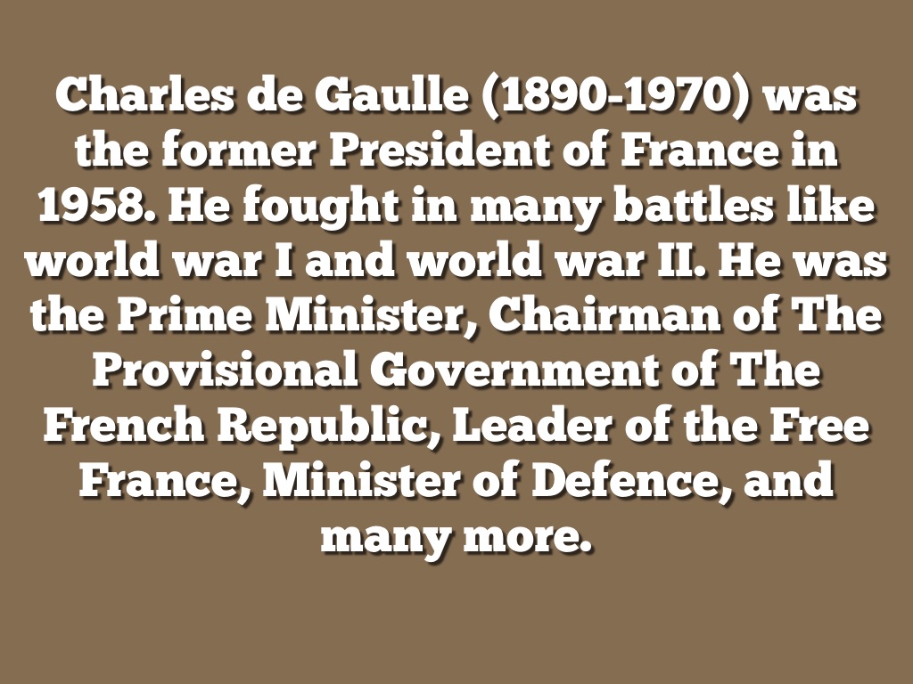 Charles de Gaulle (1890-1970) was the former President of France in 1958. He fought in many battles like world war I and world war II. He was the Prime Minister, Chairman of The Provisional Government of The French Republic, Leader of the Free France, Minister of Defence, and many more.