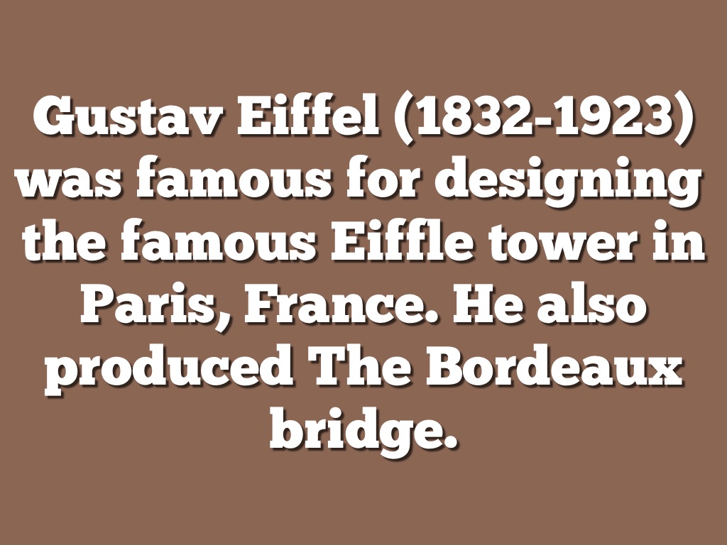 Gustav Eiffel (1832-1923) was famous for designing the famous Eiffle tower in Paris, France. He also produced The Bordeaux bridge.