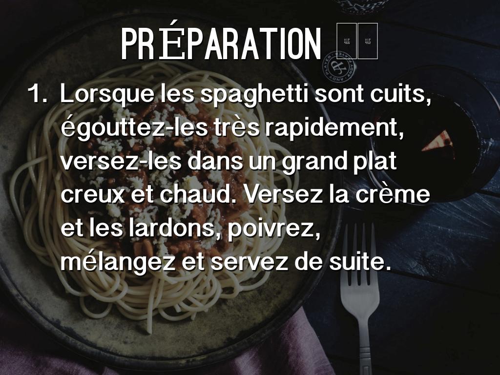 - Lorsque les spaghetti sont cuits, égouttez-les très rapidement, versez-les dans un grand plat creux et chaud. Versez la crème et les lardons, poivrez, mélangez et servez de suite.