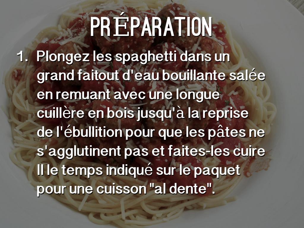 - Plongez les spaghetti dans un grand faitout d'eau bouillante salée en remuant avec une longue cuillère en bois jusqu'à la reprise de l'ébullition pour que les pâtes ne s'agglutinent pas et faites-les cuire Il le temps indiqué sur le paquet pour une cuisson "al dente".