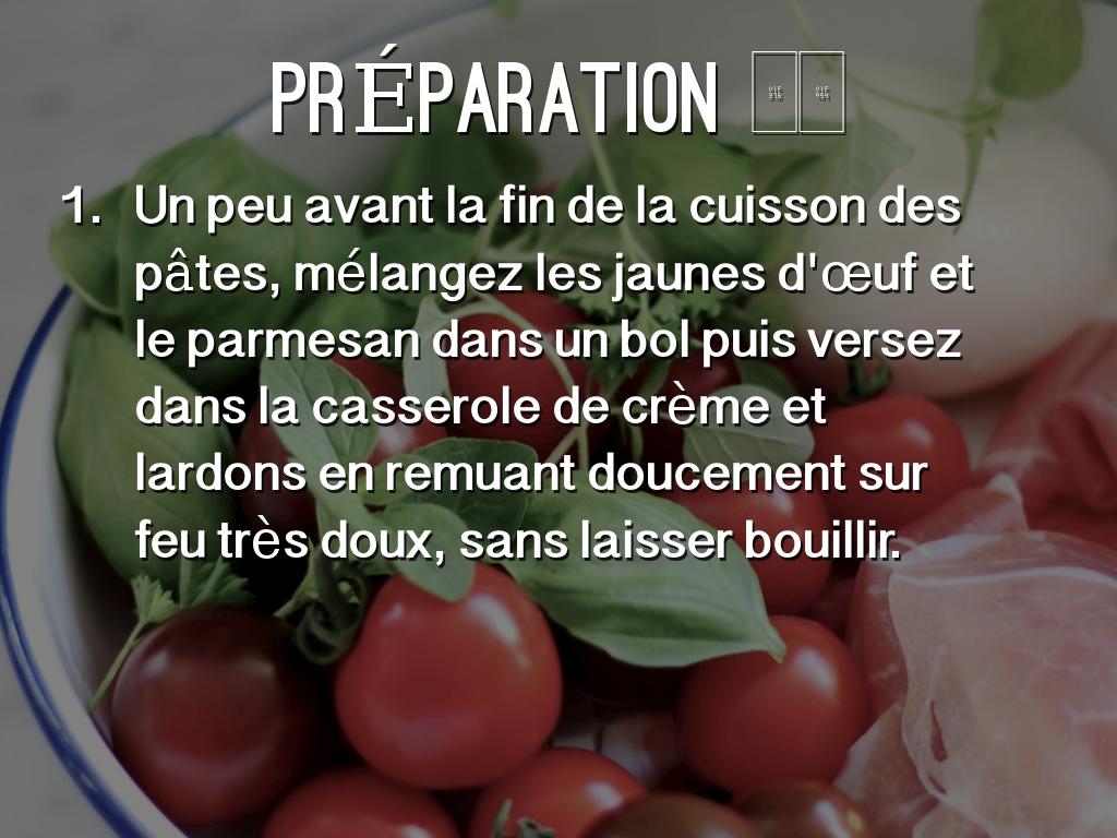 - Un peu avant la fin de la cuisson des pâtes, mélangez les jaunes d'œuf et le parmesan dans un bol puis versez dans la casserole de crème et lardons en remuant doucement sur feu très doux, sans laisser bouillir.