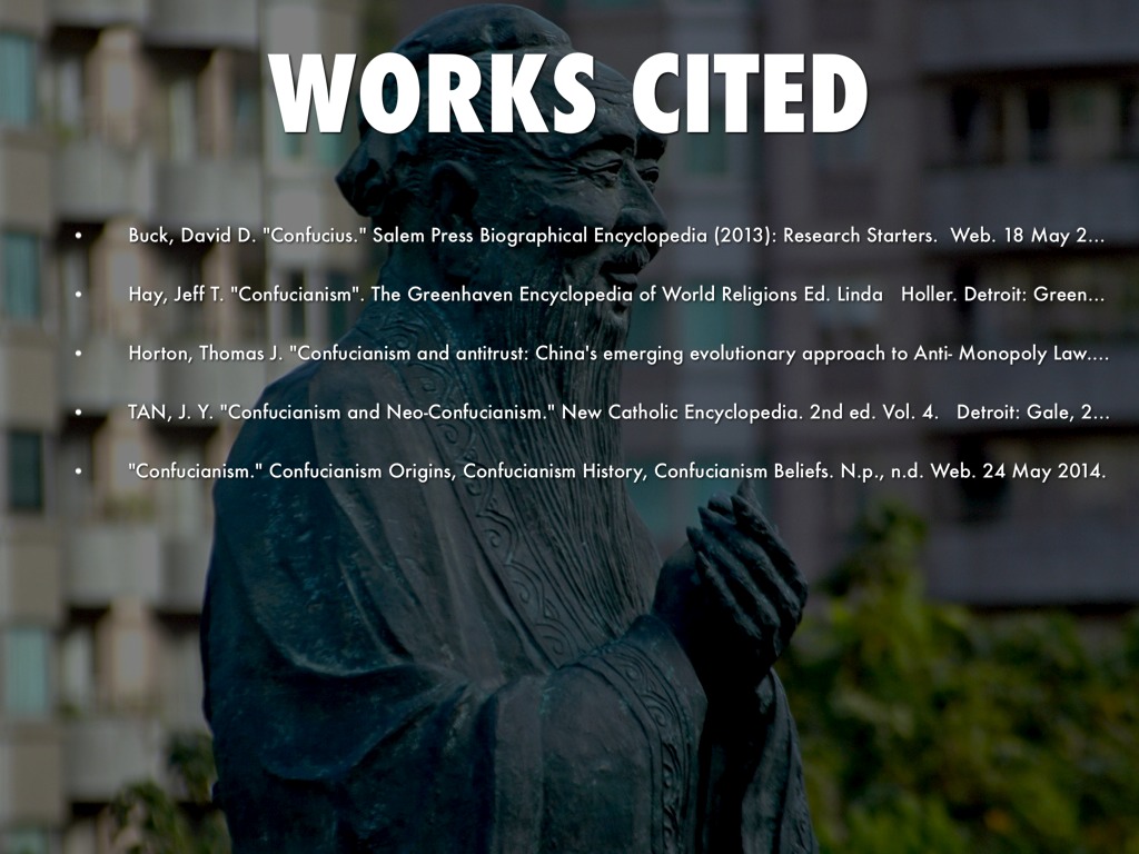 Hay, Jeff T. "Confucianism". The Greenhaven Encyclopedia of World Religions Ed. Linda Holler. Detroit: Greenhaven Press, 2007. 79-84. Gale Virtual Reference Library. 18 May 2014. Print.