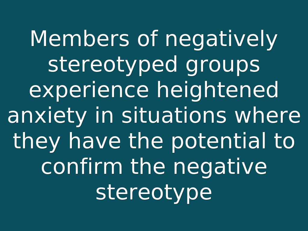 Members of negatively stereotyped groups experience heightened anxiety in situations where they have the potential to confirm the negative stereotype