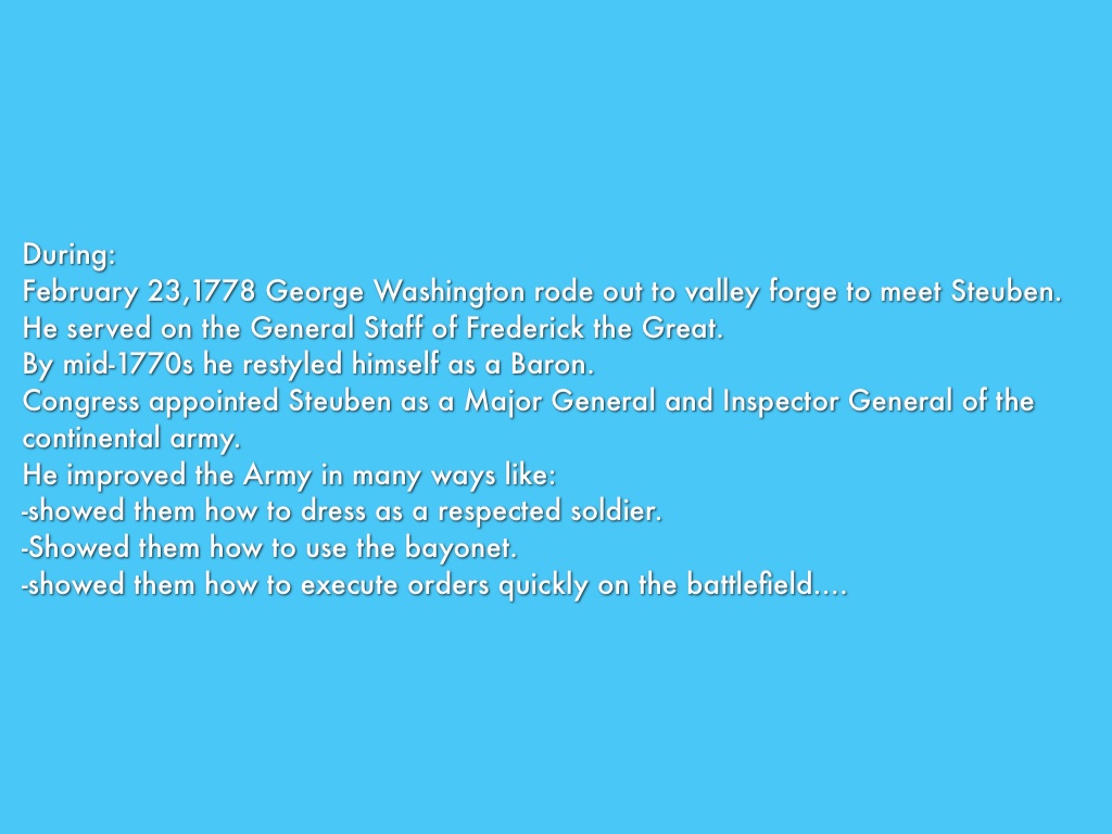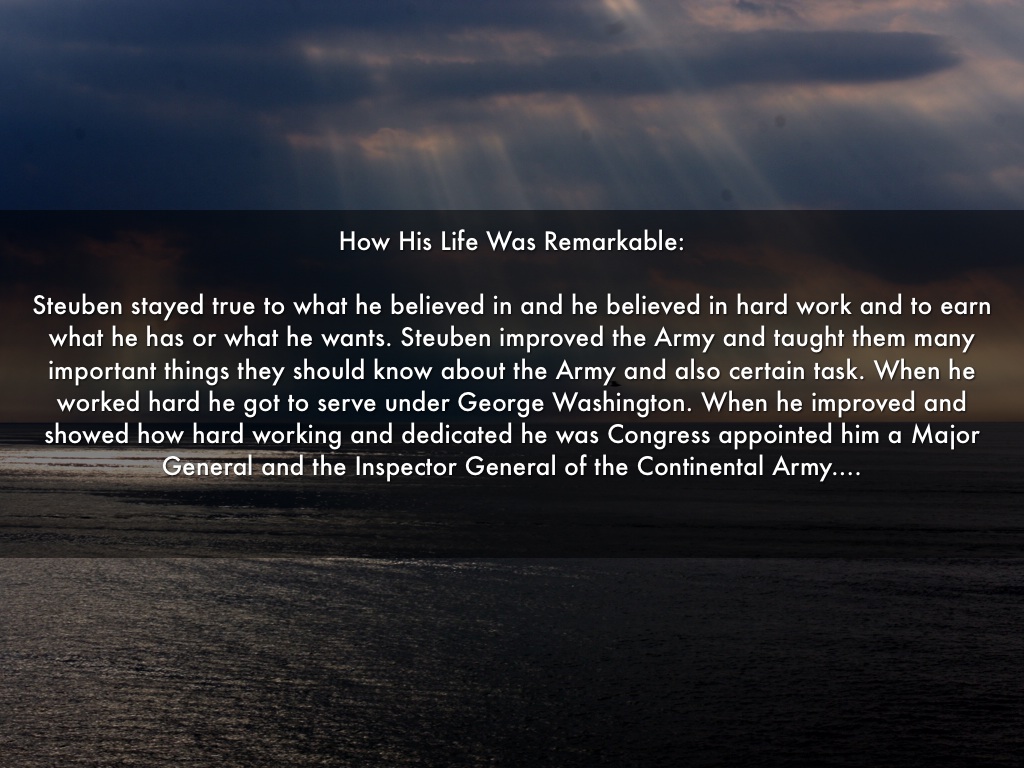 Steuben stayed true to what he believed in and he believed in hard work and to earn what he has or what he wants. Steuben improved the Army and taught them many important things they should know about the Army and also certain task. When he worked hard he got to serve under George Washington. When he improved and showed how hard working and dedicated he was Congress appointed him a Major General and the Inspector General of the Continental Army.