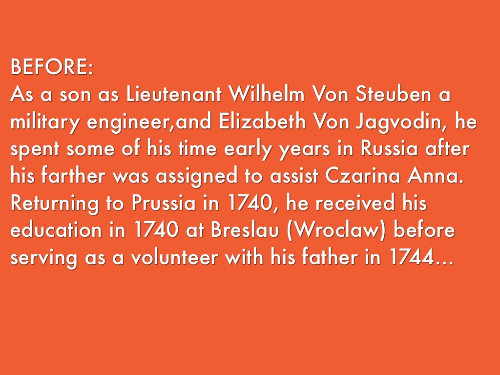 As a son as Lieutenant Wilhelm Von Steuben a military engineer,and Elizabeth Von Jagvodin, he spent some of his time early years in Russia after his farther was assigned to assist Czarina Anna. Returning to Prussia in 1740, he received his education in 1740 at Breslau (Wroclaw) before serving as a volunteer with his father in 1744