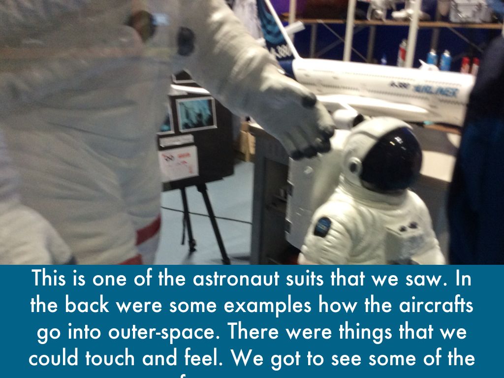 This is one of the astronaut suits that we saw. In the back were some examples how the aircrafts go into outer-space. There were things that we could touch and feel. We got to see some of the very famous astronomers.