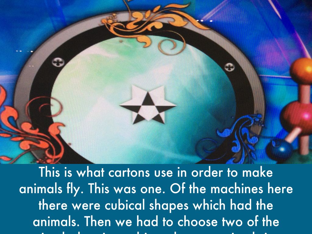 This is what cartons use in order to make animals fly. This was one. Of the machines here there were cubical shapes which had the animals. Then we had to choose two of the animals then it combines the two animals into one.