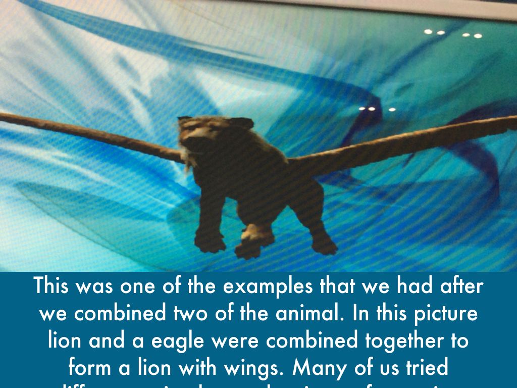 This was one of the examples that we had after we combined two of the animal. In this picture lion and a eagle were combined together to form a lion with wings. Many of us tried different animals together it was fun seeing different kinds of animals mixed together.