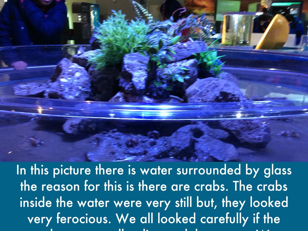 In this picture there is water surrounded by glass the reason for this is there are crabs. The crabs inside the water were very still but, they looked very ferocious. We all looked carefully if the crabs were really alive and they were. We thought they were dead as they were very still.