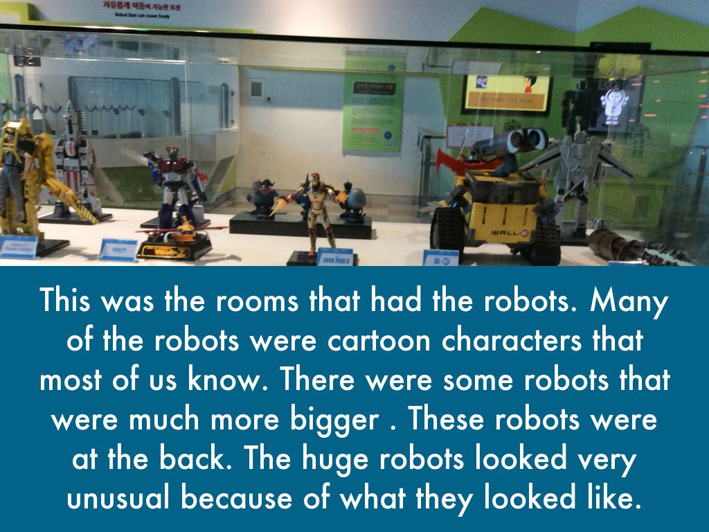 This was the rooms that had the robots. Many of the robots were cartoon characters that most of us know. There were some robots that were much more bigger . These robots were at the back. The huge robots looked very unusual because of what they looked like.