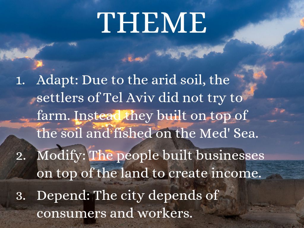Adapt: Due to the arid soil, the settlers of Tel Aviv did not try to farm. Instead they built on top of the soil and fished on the Med' Sea.
