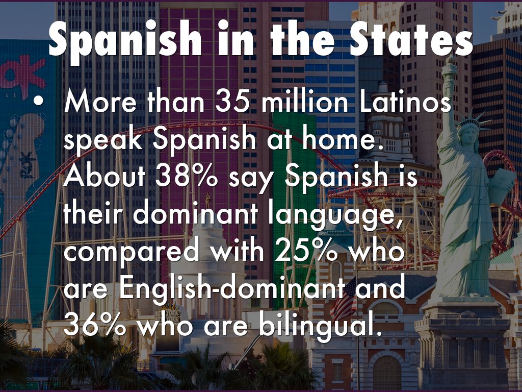 More than 35 million Latinos speak Spanish at home. About 38% say Spanish is their dominant language, compared with 25% who are English-dominant and 36% who are bilingual.