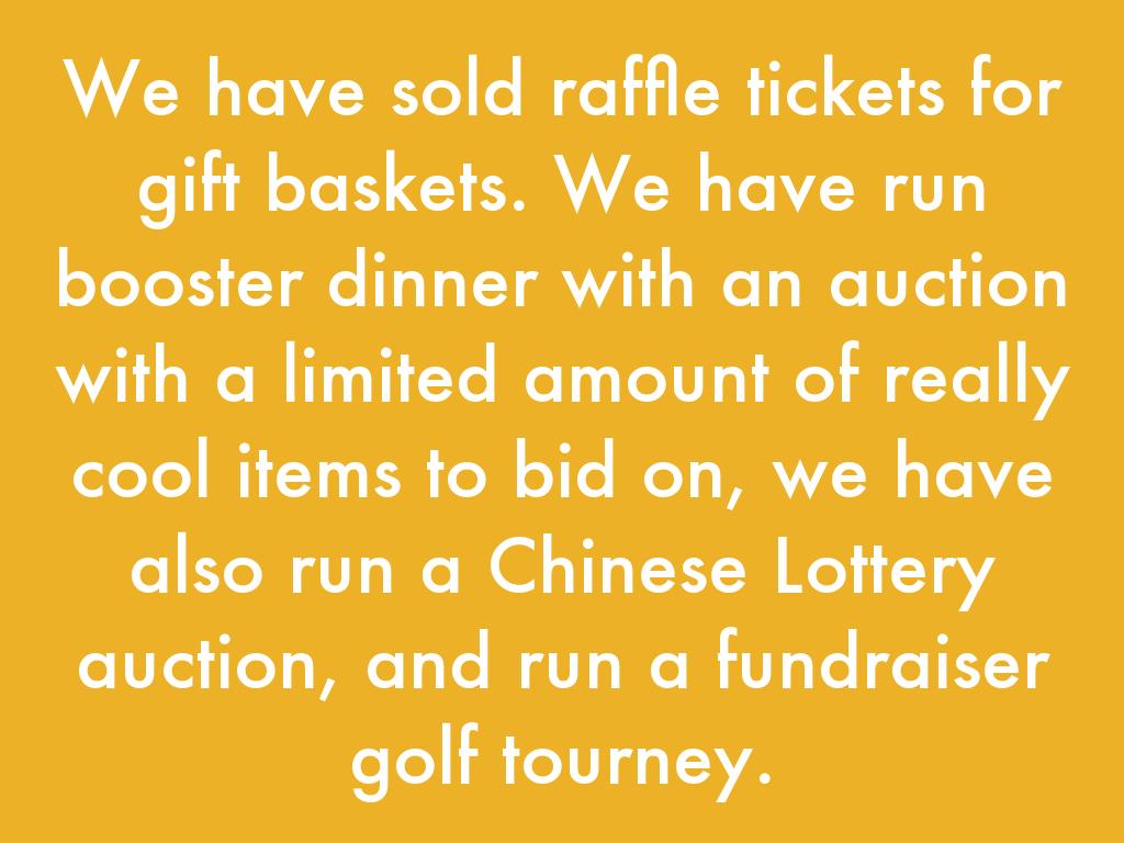 We have sold raffle tickets for gift baskets. We have run booster dinner with an auction with a limited amount of really cool items to bid on, we have also run a Chinese Lottery auction, and run a fundraiser golf tourney.