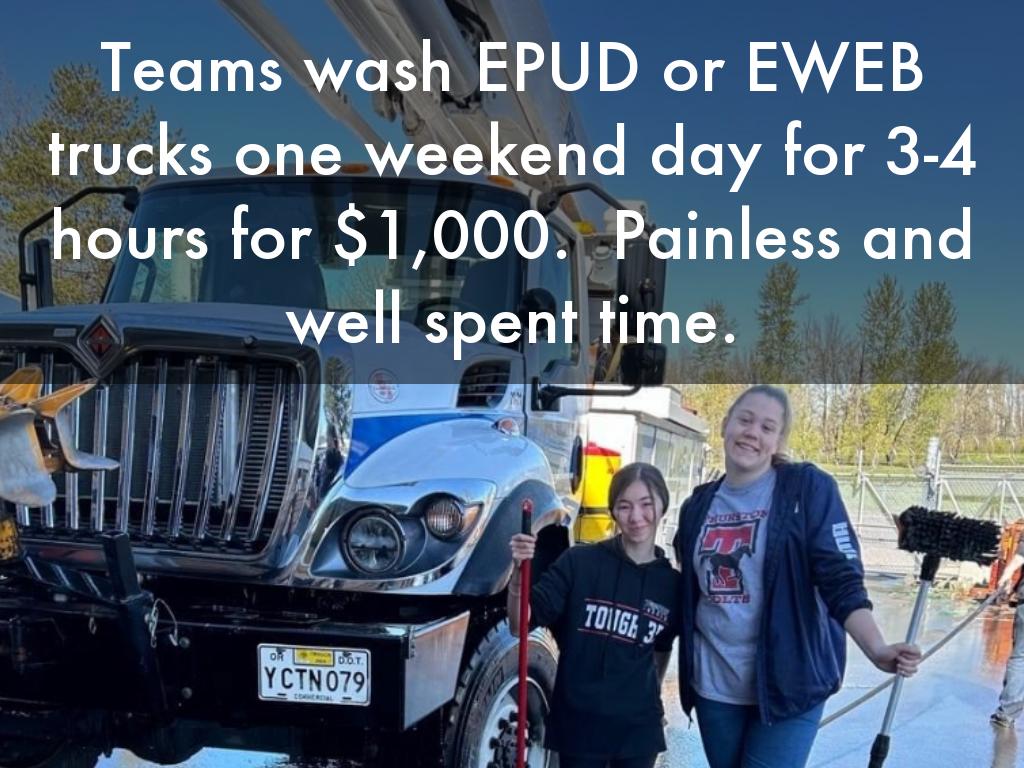 Teams wash EPUD or EWEB trucks one weekend day for 3-4 hours for $1,000. Painless and well spent time.