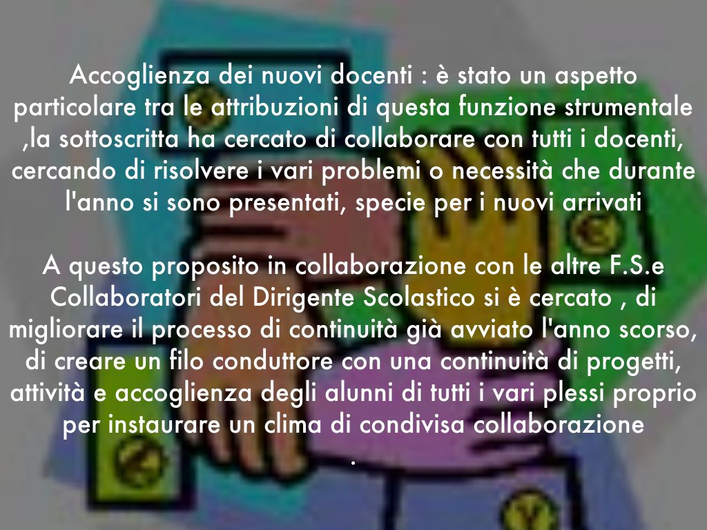 Accoglienza dei nuovi docenti : è stato un aspetto particolare tra le attribuzioni di questa funzione strumentale ,la sottoscritta ha cercato di collaborare con tutti i docenti, cercando di risolvere i vari problemi o necessità che durante l'anno si sono presentati, specie per i nuovi arrivati