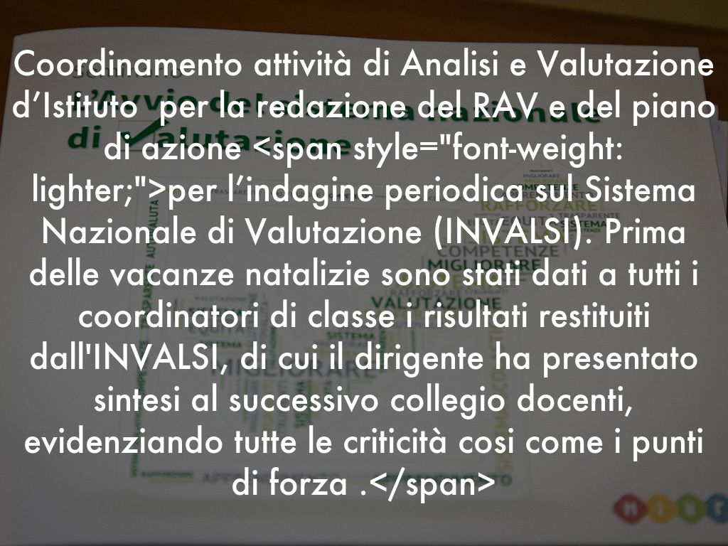 per la redazione del RAV e del piano di azione per l’indagine periodica sul Sistema Nazionale di Valutazione (INVALSI). Prima delle vacanze natalizie sono stati dati a tutti i coordinatori di classe i risultati restituiti dall'INVALSI, di cui il dirigente ha presentato sintesi al successivo collegio docenti, evidenziando tutte le criticità cosi come i punti di forza .