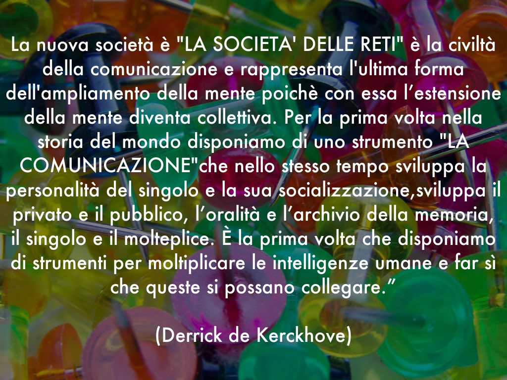 La nuova società è "LA SOCIETA' DELLE RETI" è la civiltà della comunicazione e rappresenta l'ultima forma dell'ampliamento della mente poichè con essa l’estensione della mente diventa collettiva. Per la prima volta nella storia del mondo disponiamo di uno strumento "LA COMUNICAZIONE"che nello stesso tempo sviluppa la personalità del singolo e la sua socializzazione,sviluppa il privato e il pubblico, l’oralità e l’archivio della memoria, il singolo e il molteplice. È la prima volta che disponiamo di strumenti per moltiplicare le intelligenze umane e far sì che queste si possano collegare.”
