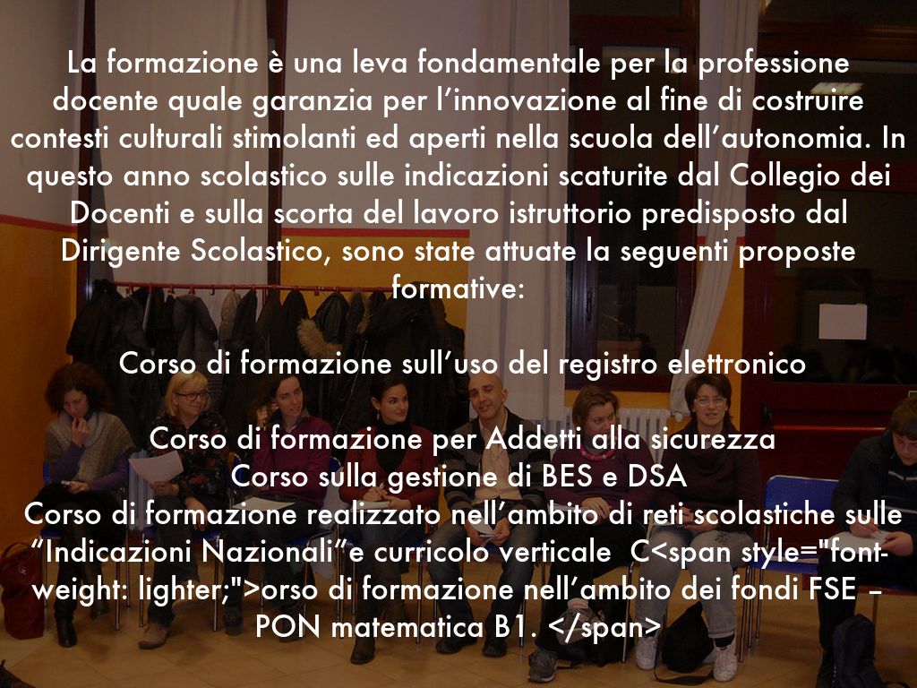 La formazione è una leva fondamentale per la professione docente quale garanzia per l’innovazione al fine di costruire contesti culturali stimolanti ed aperti nella scuola dell’autonomia. In questo anno scolastico sulle indicazioni scaturite dal Collegio dei Docenti e sulla scorta del lavoro istruttorio predisposto dal Dirigente Scolastico, sono state attuate la seguenti proposte formative: