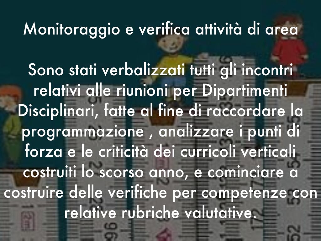 Sono stati verbalizzati tutti gli incontri relativi alle riunioni per Dipartimenti Disciplinari, fatte al fine di raccordare la programmazione , analizzare i punti di forza e le criticità dei curricoli verticali costruiti lo scorso anno, e cominciare a costruire delle verifiche per competenze con relative rubriche valutative.
