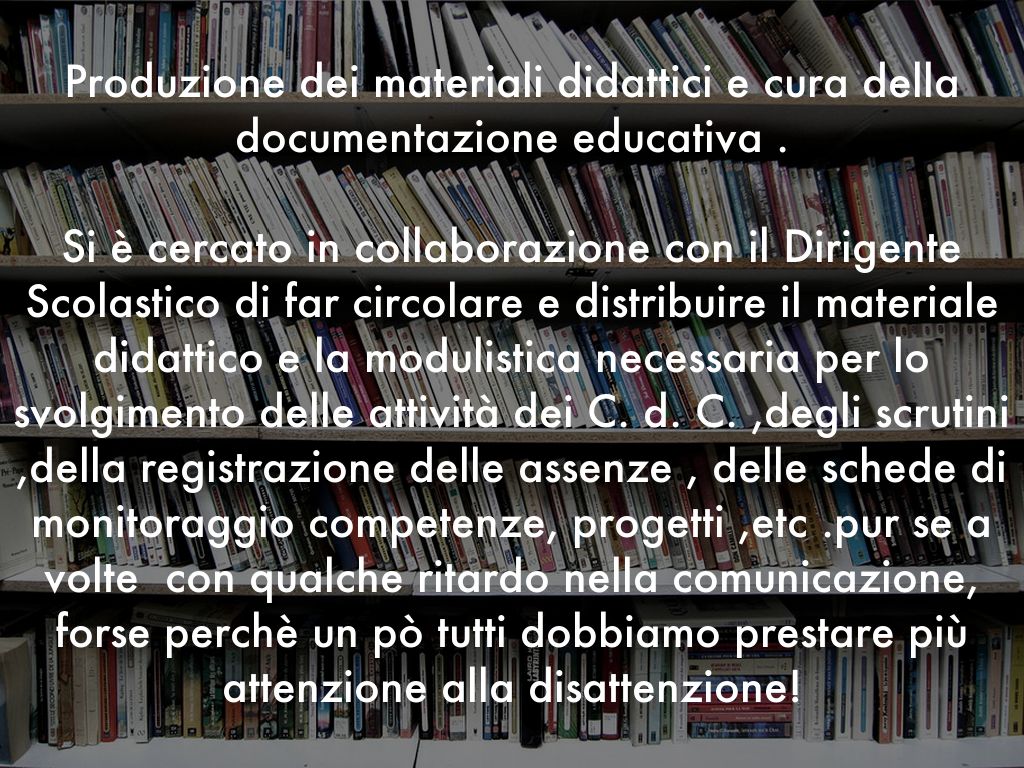 Si è cercato in collaborazione con il Dirigente Scolastico di far circolare e distribuire il materiale didattico e la modulistica necessaria per lo svolgimento delle attività dei C. d. C. ,degli scrutini ,della registrazione delle assenze , delle schede di monitoraggio competenze, progetti ,etc .pur se a volte con qualche ritardo nella comunicazione, forse perchè un pò tutti dobbiamo prestare più attenzione alla disattenzione!