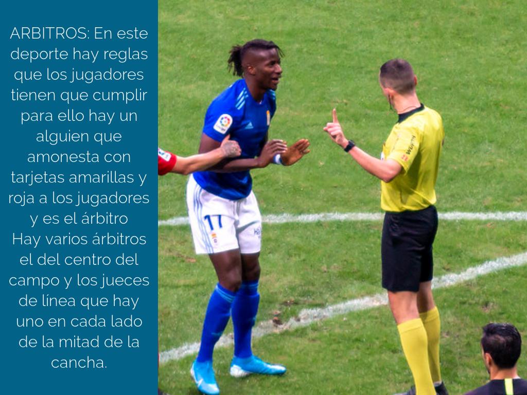 ARBITROS: En este deporte hay reglas que los jugadores tienen que cumplir para ello hay un alguien que amonesta con tarjetas amarillas y roja a los jugadores y es el árbitro
