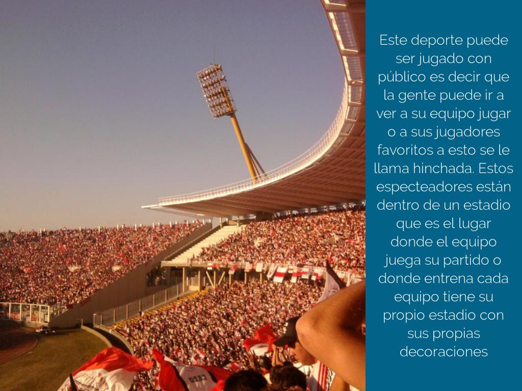 Este deporte puede ser jugado con público es decir que la gente puede ir a ver a su equipo jugar o a sus jugadores favoritos a esto se le llama hinchada. Estos especteadores están dentro de un estadio que es el lugar donde el equipo juega su partido o donde entrena cada equipo tiene su propio estadio con sus propias decoraciones